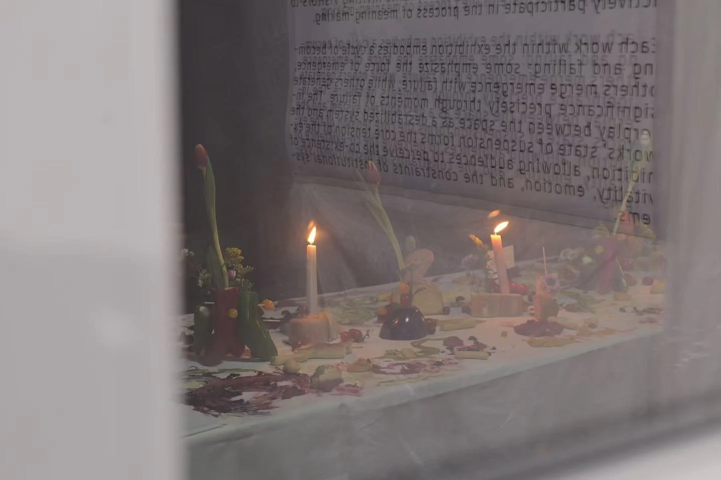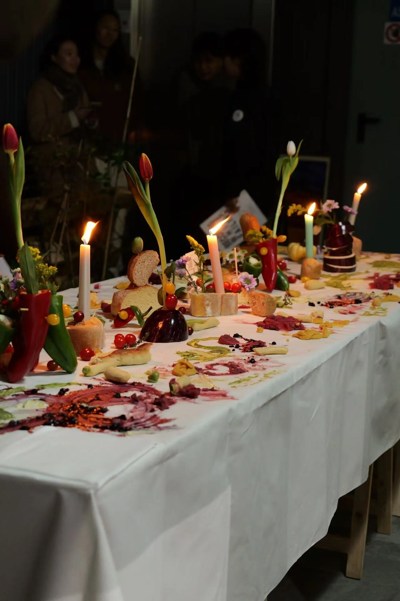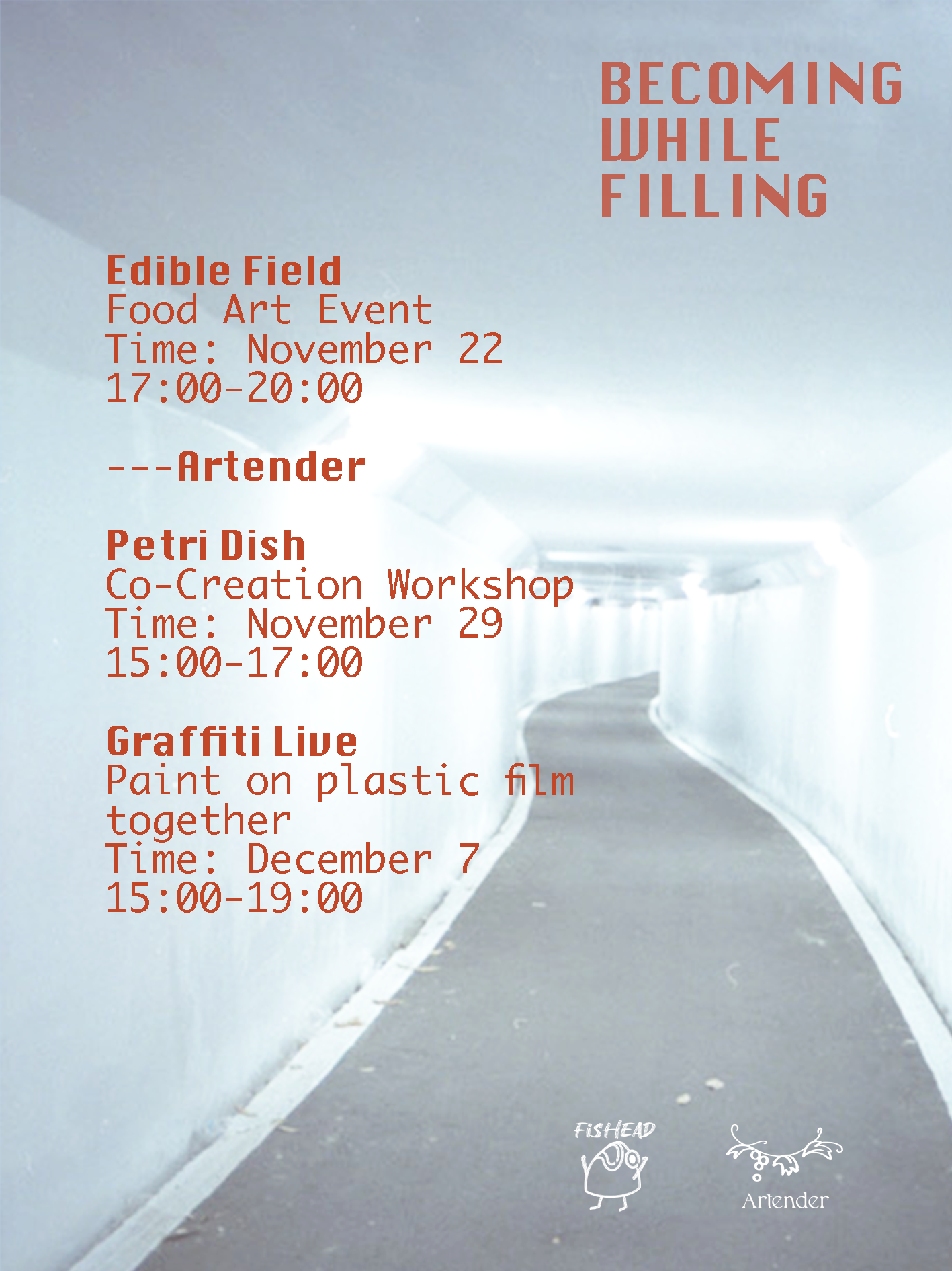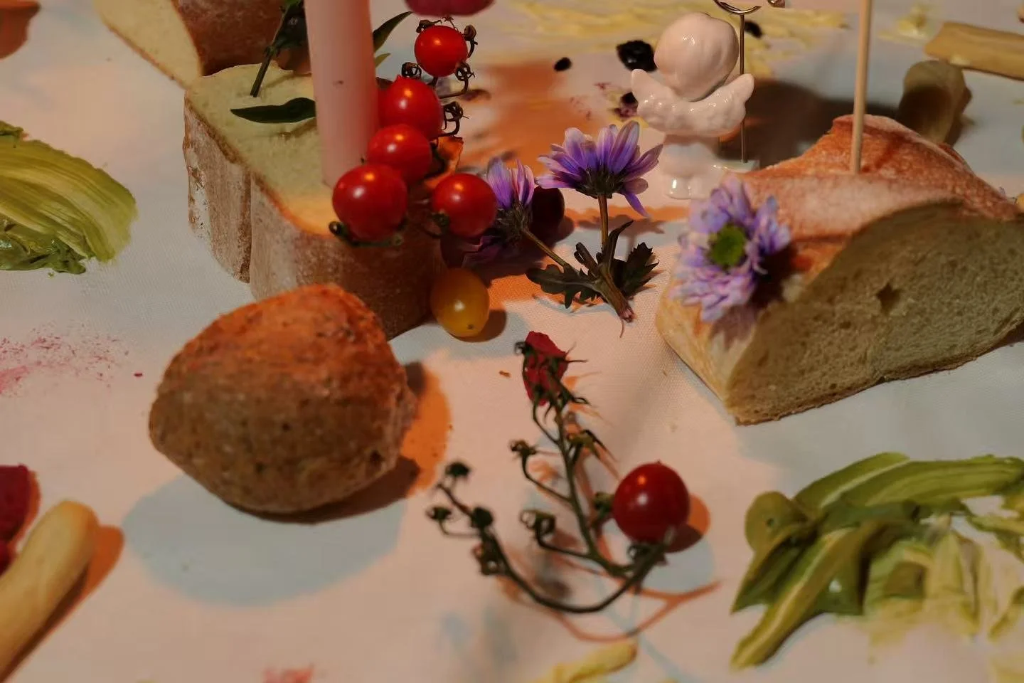 On November 22, during the exhibition opening, Fishead Lab collaborated with ArtTender to present the Edible Field Food Art Workshop. Curated by ArtTender, an interactive food-art table was constructed in front of the exhibition space using bread, vegetables, flowers, and sauces. Visitors were invited to taste, touch, and rearrange the edible elements, leaving behind traces of their actions. Through continuous participation and transformation, these accumulated gestures became the final artwork.
