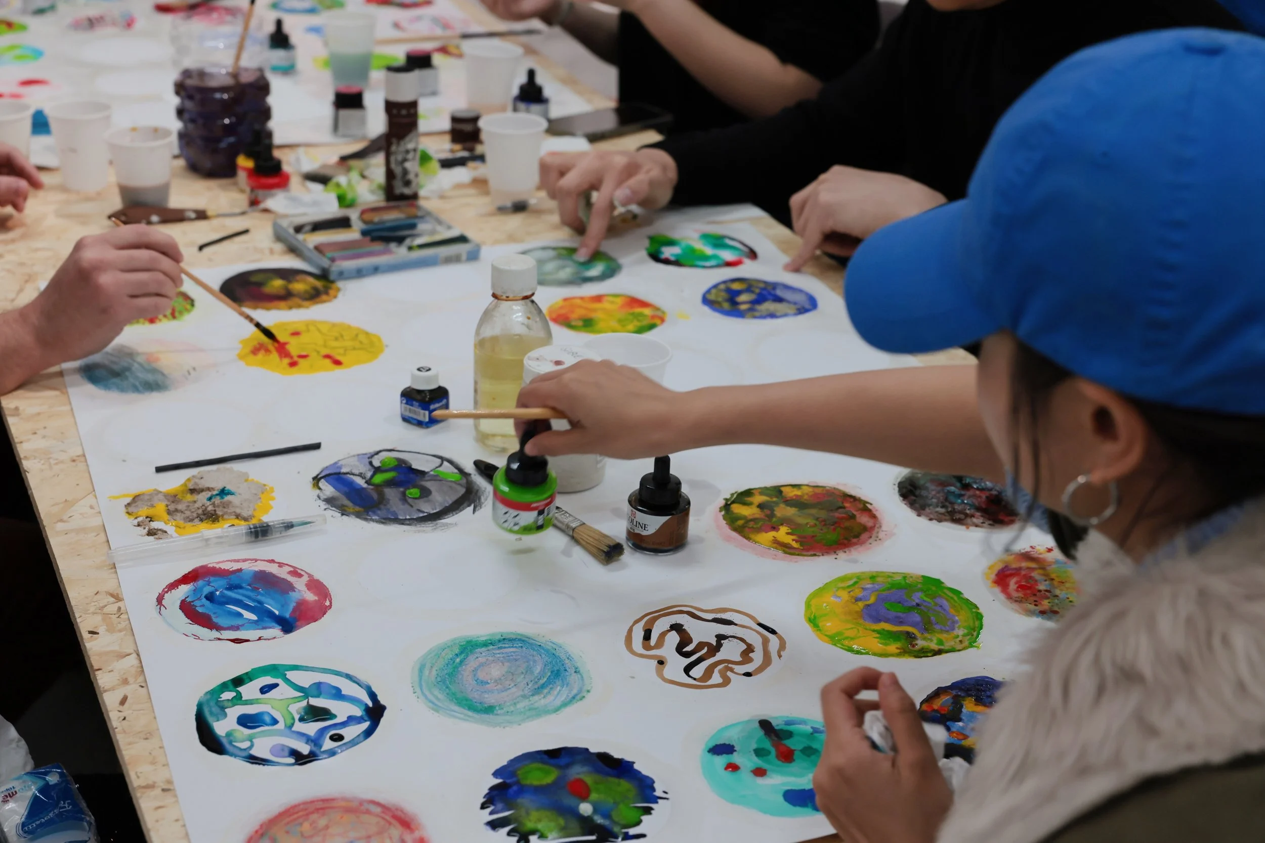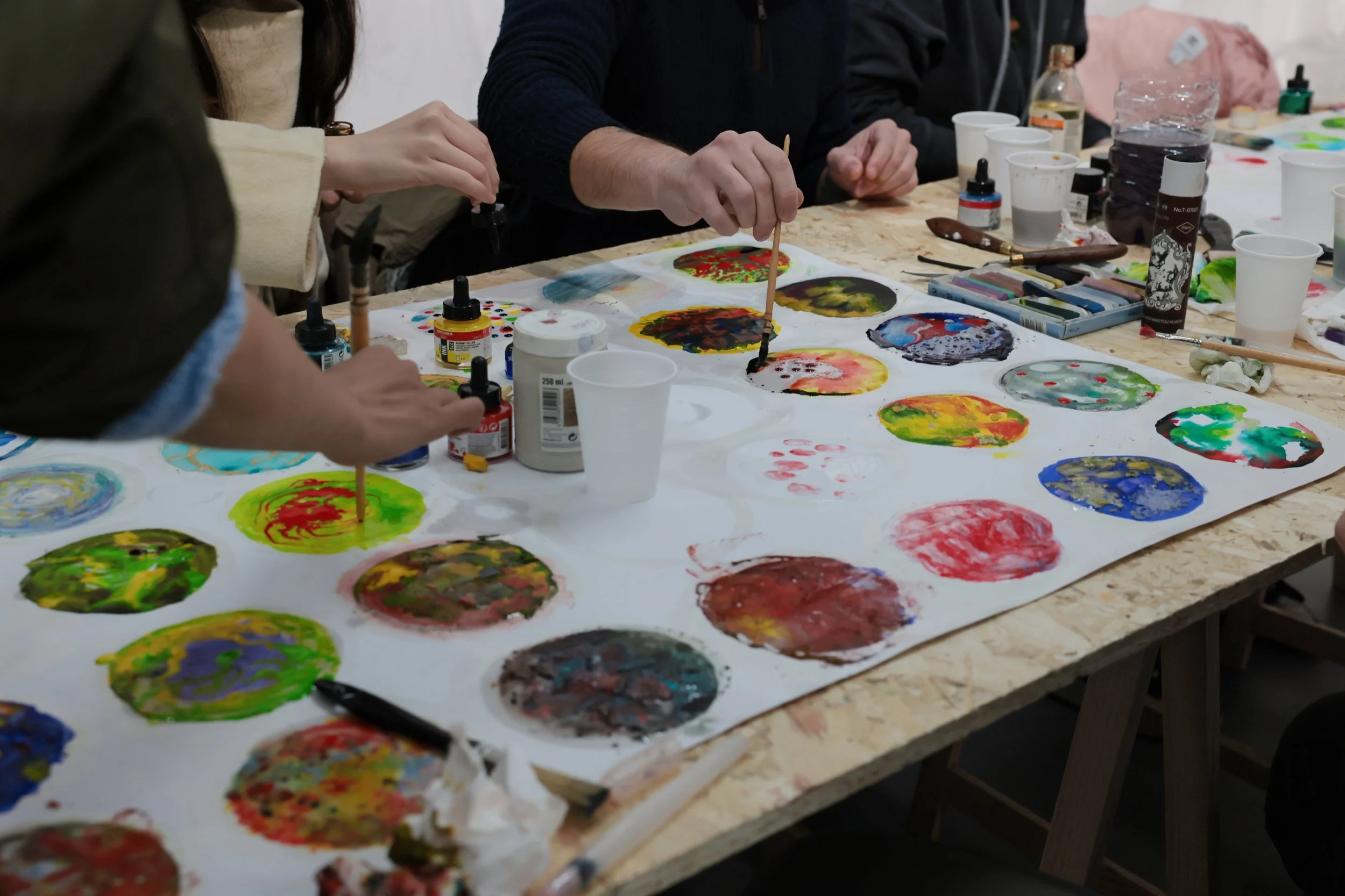 On November 29, Fishead Lab hosted a material experimentation workshop themed around the concept of a “Bacterial Culture Dish.” An improvised “laboratory” was set up within the exhibition space, drawing on the visual and conceptual language of petri dishes. Participants were encouraged to freely experiment with painting materials and chemical agents, observing material reactions and properties. Accidents were embraced as integral to the creative process, allowing change, uncertainty, and imagination to generate works in unexpected ways.